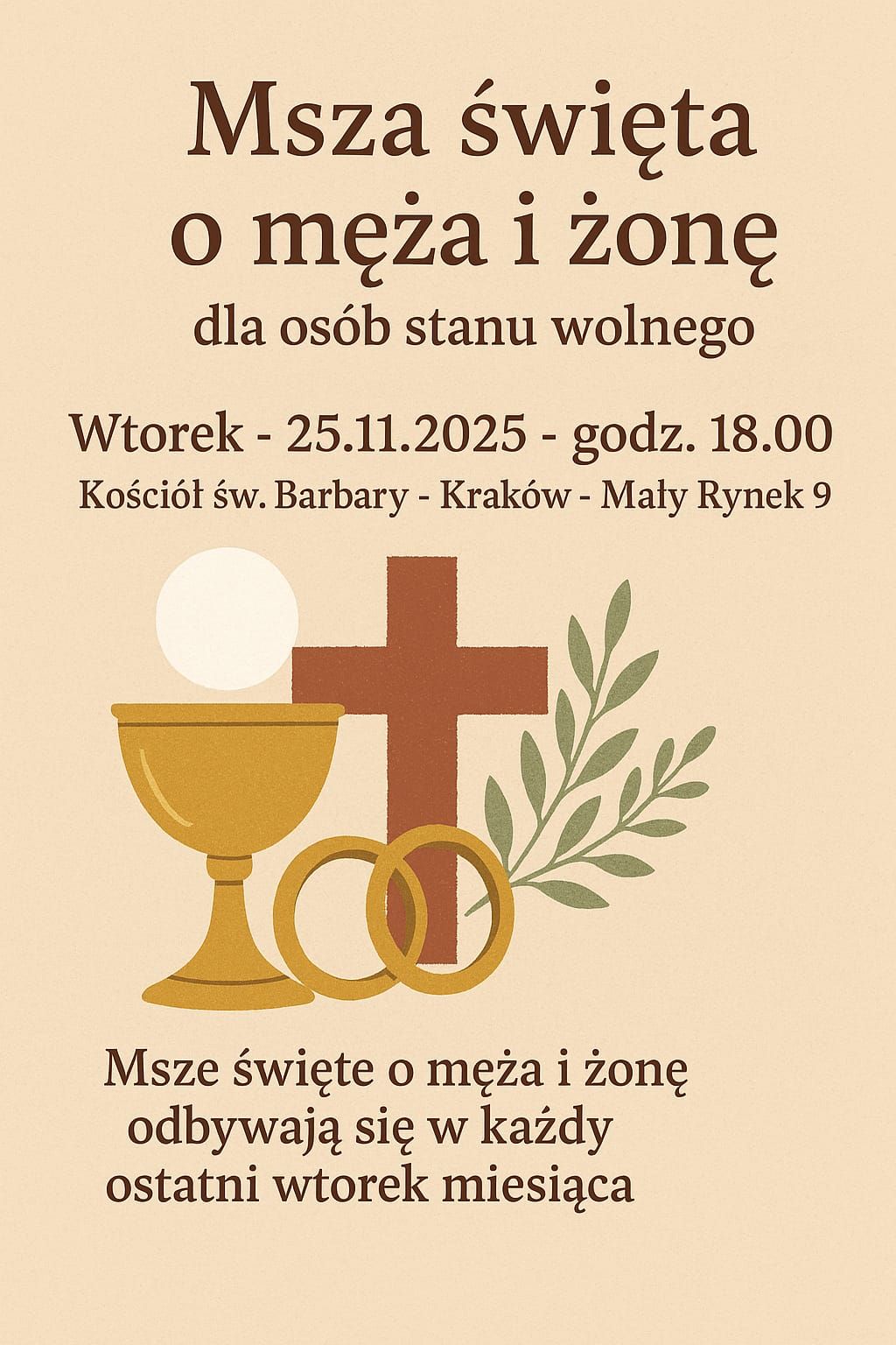 Zapraszamy na kolejną Mszę świętą dla singli: “O męża i żonę” we wtorek 25 listopada o 18:00 w kościele Świętej Barbary (przy placu Mariackim) a po niej na potańcówkę w Szkole Sióstr Prezentek (ul. Św. Jana 7). Na potańcówkę będą wpuszczane tylko te osoby które uczestniczyły we Mszy świętej i będą miały wejściówkę. Wejściówki będą rozdawane na Mszy świętej tylko wewnątrz kościoła.