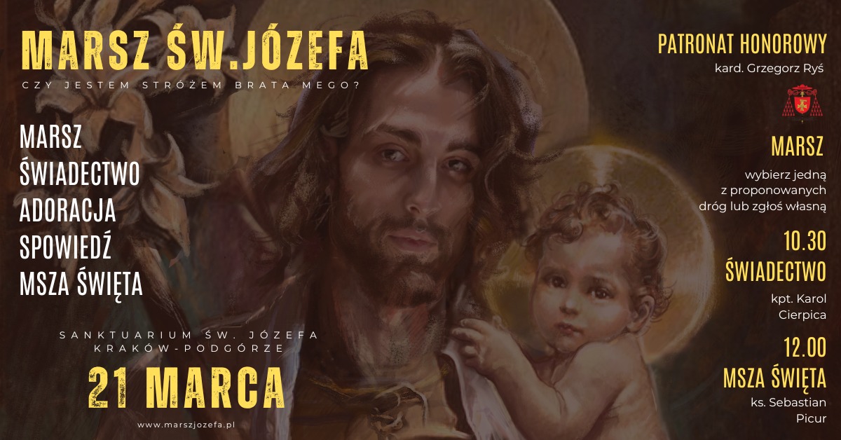 W sobotę 21 marca 2026 r. zapraszamy do Krakowa na Marsz św. Józefa – męską pielgrzymkę do Sanktuarium św. Józefa na Podgórzu. Z okazji przypadającej dwa dni wcześniej uroczystości wspólnie wyruszymy w drogę przez miasto.Marsz organizują katolickie wspólnoty mężczyzn, w tym Rycerze Kolumba, Mężczyźni św. Józefa, Formacja Męskiej Tożsamości oraz Wojownicy Maryi.